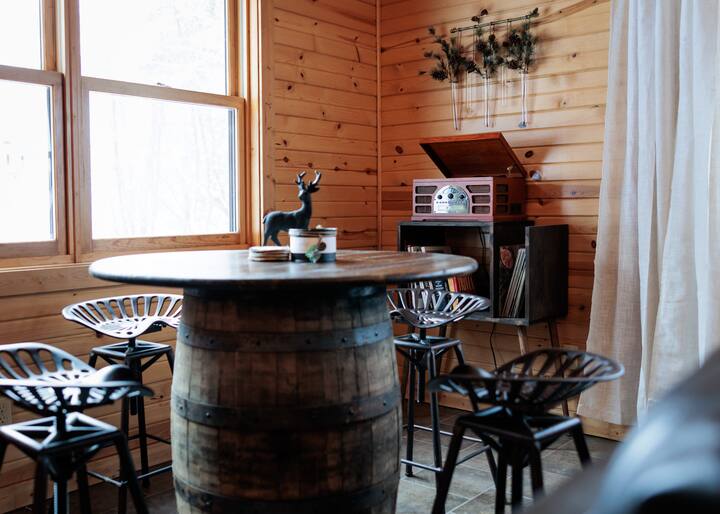 Open kitchen/dining/living room provides an awesome space to entertain your family & friends. Large dining table & unique pub style barrel table w/tractor seat stools.